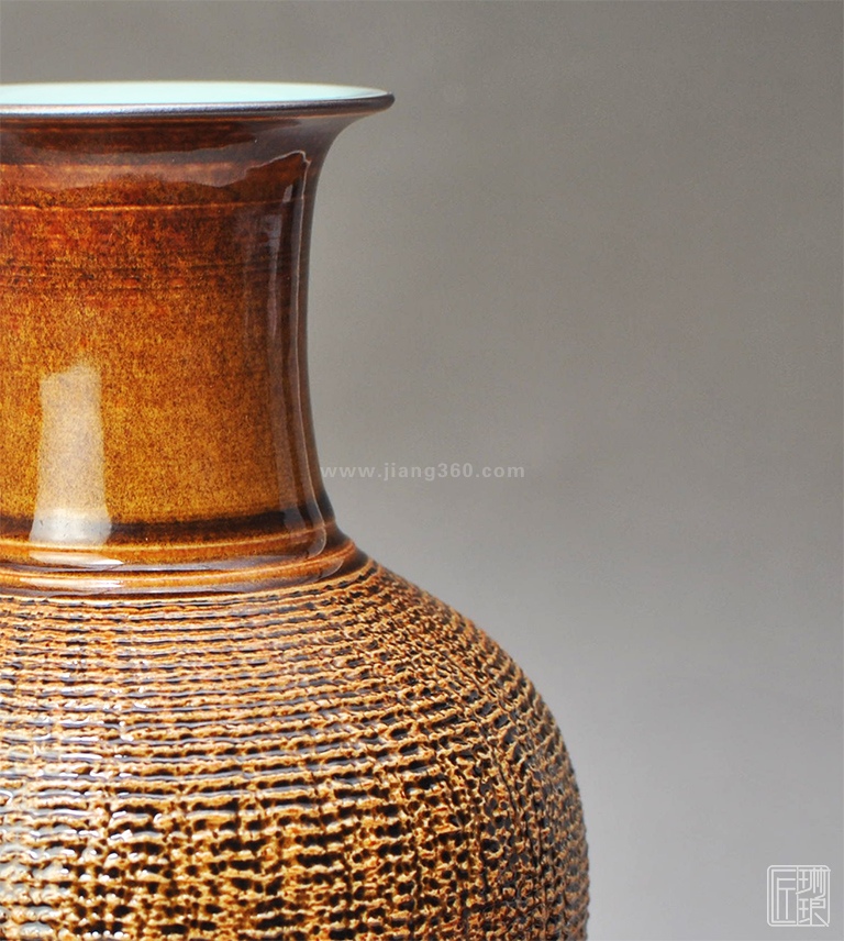 “跳刀”作为独特的陶瓷装饰工艺曾领数代风骚,透过该瓷瓶我们能一窥其别具一格的风韵和魅力。瓶颈施草木灰釉,触感细腻光滑;瓶肩以下采用大面积“跳刀”技艺加草木灰釉,藤编状纹理具有浅浮雕般的触感,与瓶口微露出的幽淡隽永的天青釉在视觉、触觉上形成强烈反差,整体彰显出一种拙朴天然的艺术风格。