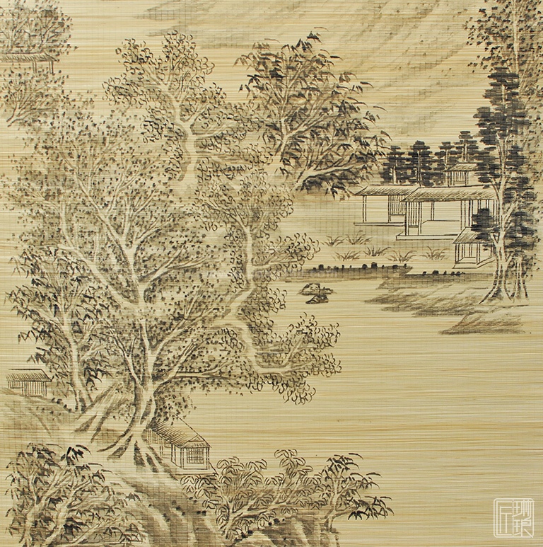 梁平竹帘取材于大自然的慈竹,其色泽典雅,工艺精细,融合国画写意的表现风格。水墨画“秋山草堂图”山林树木苍郁茂密而具有浑远的空间感,山脚草堂临水而居,远山淡墨轻岚,近树浓墨重彩,与世无争隐居山野的情怀,是许多人的精神向往。