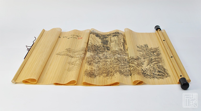 在竹帘的幅面上运用传统的国画技法,画出山水、人物、花鸟等,成为精美的壁饰、屏风、挂帘、装饰画等。